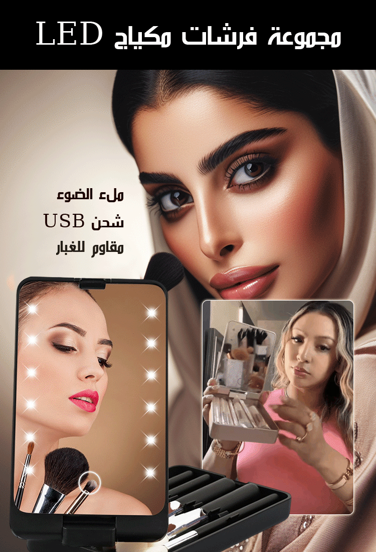 مجموعة فراشي المكياج مع مرآه وضوء LED