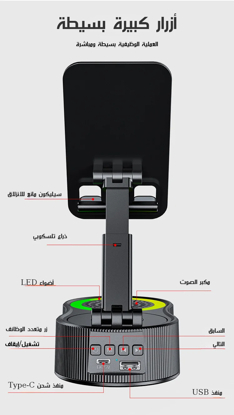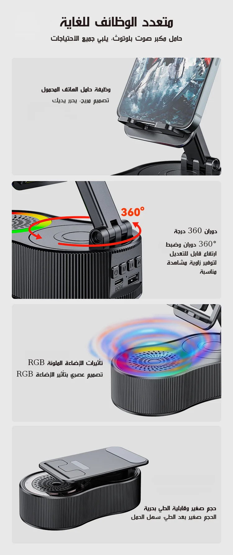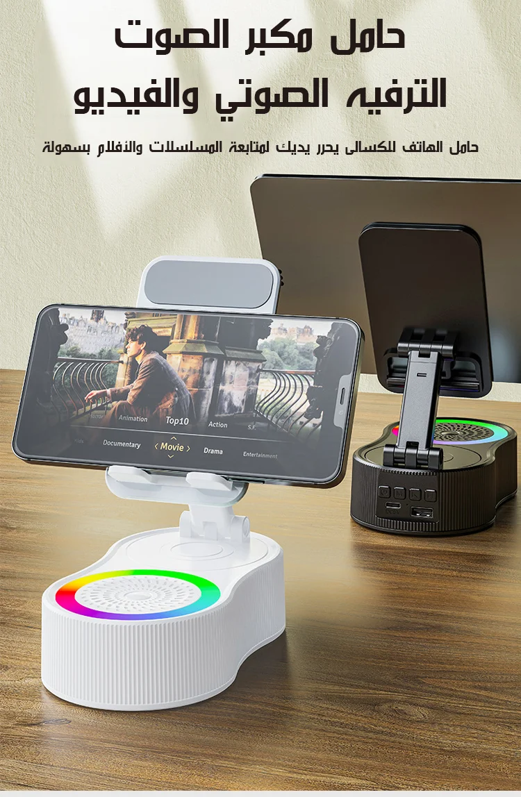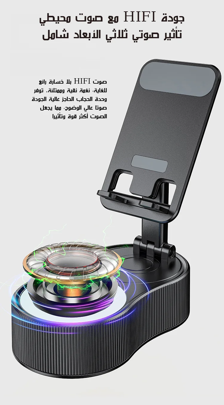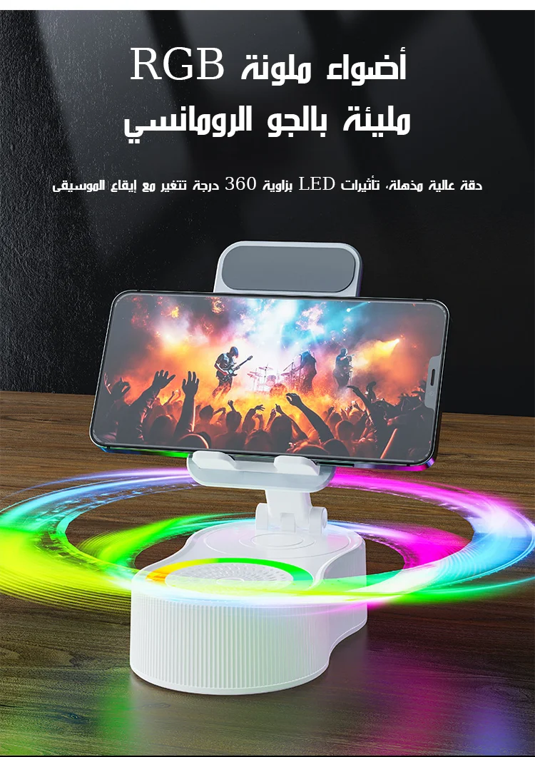 مكبر صوت بلوتوث مع حامل هاتف دوار 360 درجة وقابل للارتفاع، مكبر صوت صغير محمول مزود بإضاءة محيطية